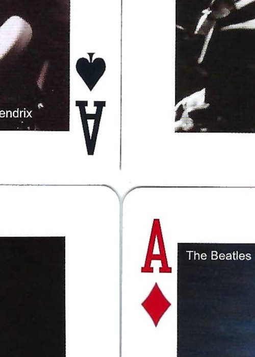 50 for individual photographs of music Legends including the Beatles, Elvis Presley, Bill Haley, Led Zeppelin and Madonna. There are seven colour and forty-eight monochromes mainly Getty images, save for the Ace of Diamonds and Eight of Clubs. Many images are all the artists belting out one of their songs, with very few posed. The Beatles get four cards for themselves (A group shot, Lennon, McCartney, Harrison), but the rest are all unique. To gain a place in the deck, it looks like each performer had to be popular both sides of the Atlantic. A colour shot of Status Quo adorns the back of the cards. The pack was designed by Haime & Butler in London (Bermondsey at the time). The printer was chosen by WORLDWIDE CO. of Acton who commissioned the pack and distributed it in the gift trade. About 10,000 were sold. The selection of pop stars was chosen by Nicholas Bird’s (Owner of Bird Playing Cards) postman, Simon Johnston, who was a rock buff! The deck did not include Nirvana, because Nicholas could not find a good image, and the omission raised eyebrows as they were important at that time. Image rights were a problem in the USA and for that reason they were not sold there or in Canada. They may have been reprinted once but ceased to be offered around 2007. The printing and manufacture were very cheap, and Nicholas now uses Piatnik for his supplier and printer. With grateful thanks to Nicholas Bird for his information, memories and anecdotes.