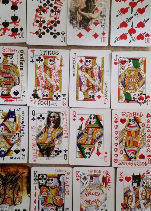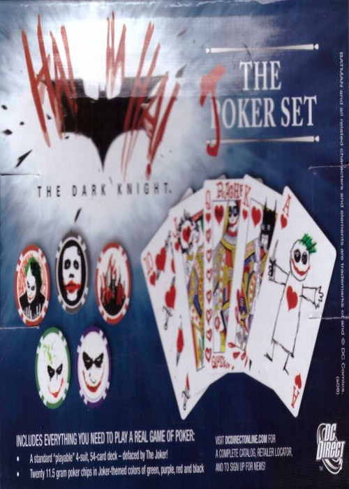 While another Limited Edition version numbered to 3,000 was also available, this entry is for the more common set created for DC Direct and FYE stores. It includes 20 11.5 oz clay poker chips (5 of each color) and the deck itself which is a standard deck made to look like the Joker defaced them. It was created to promote and be a fan deck for the movie The Dark Knight.