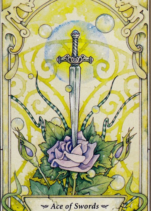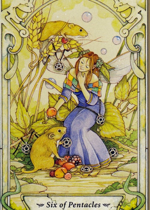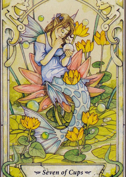 The Mystic Faerie Tarot is an enchanting faerie tarot painted in watercolours by fantasy artist Linda Ravenscroft. Ornate Bordereds and gold edges surround tarot images of sprites, nymphs, mermaids and faeries, in a charming, pretty and readable new tarot deck.