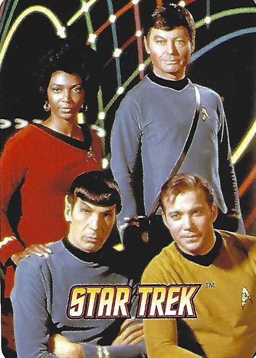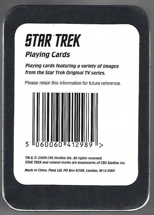 A 52 card set plus two jokers. There are 13 different poor quality colour photographs (One on each card value, one on both jokers) from the original 1960’s television series by Gene Rodenberry. The cards are not boxed, but are within a metallic tin.