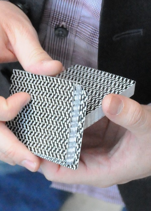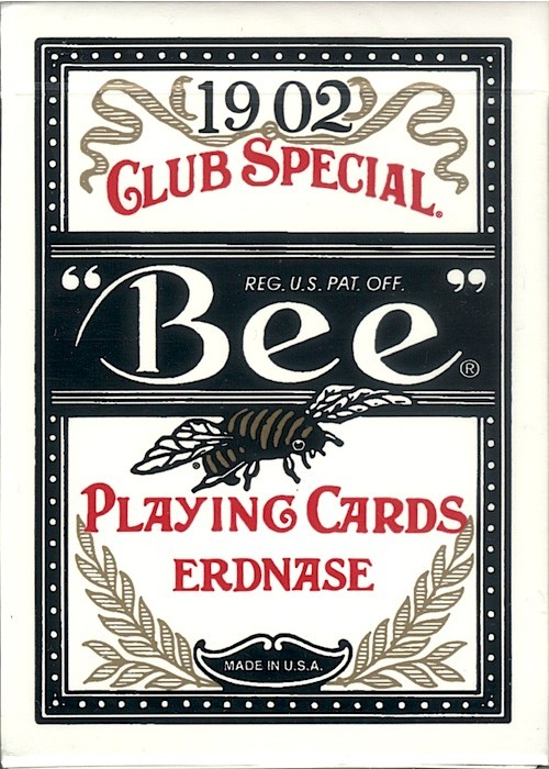 Conjuring Arts is very proud to release our first decks of Erdnase 1902 brand cards. These commemorative decks designed by Guy Hollingworth (with additional face artwork by Dan White) are printed on exclusive Bee Casino 825 paper and are made with a special coating to ensure the best handling. They’ve been cut the same way as Richard Turner has his cut so they faro and shuffle extremely well. We are now releasing the first design and color in what will be a series. It is the Black Smith Back named in honor of Marshall D. Smith the illustrator of The Expert at the Card Table. The overall Bee like pattern is actually made up of tiny reproductions of the hands in the illustrations of the great card classic. These decks also use the original faces that were used by U.S. Playing Card Co. in 1902. These great faces have somewhat larger pips and somewhat smaller indices which combine to create an unusually attractive face. A Conjuring Arts representative supervised all aspects of the production of these cards including being personally at the factory at the time of printing the backs, embossing, crushing and the final cutting and casing. Available in Cambric and Ivory finishes