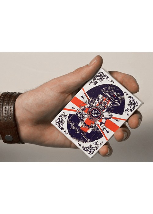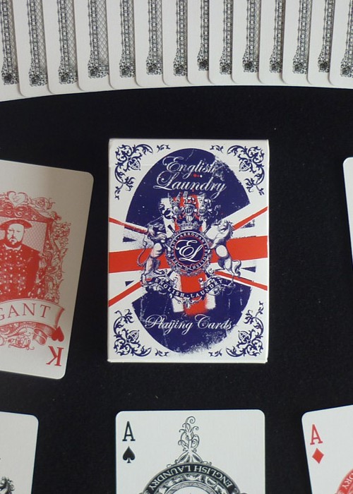 Conceived for the magicians Dave and Dan Buck, the English Laundry deck features the hand-drawn art of Christopher Wick, the renowned fashion designer of the English Laundry brand. A limited edition, the deck is poker sized, features silver metallic ink, and was printed on Bicycle stock. Released in 2010 to commemorate the launch of their new line of button-up shirts. All the court cards are hand-drawn: the King displays the picture of King Henry VIII and has the word “Arrogant” written underneath. The Queen is – supposedly – the hand-drawn picture of Queen Elizabeth I and has the word Elegant written underneath. The Jack displays the picture of Winston Churchill and has the word “English” written below. The deck also includes four custom Aces, two custom Jokers, blank faced gaff card, as well as a double backed gaff card.