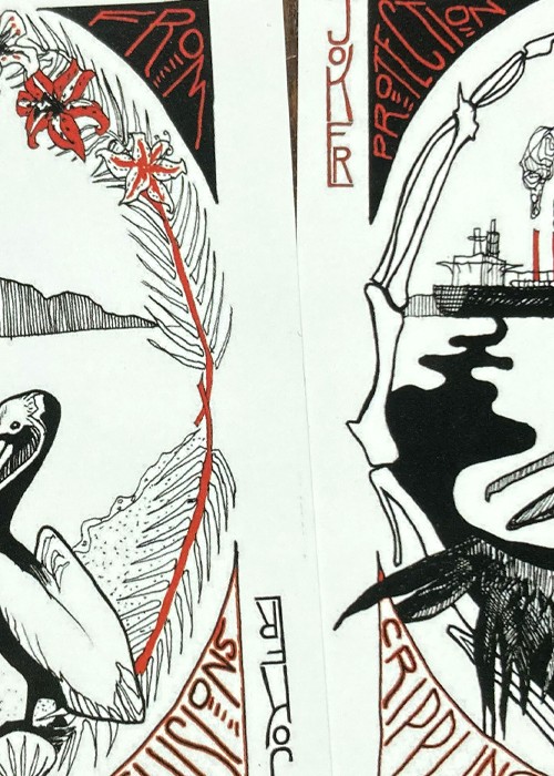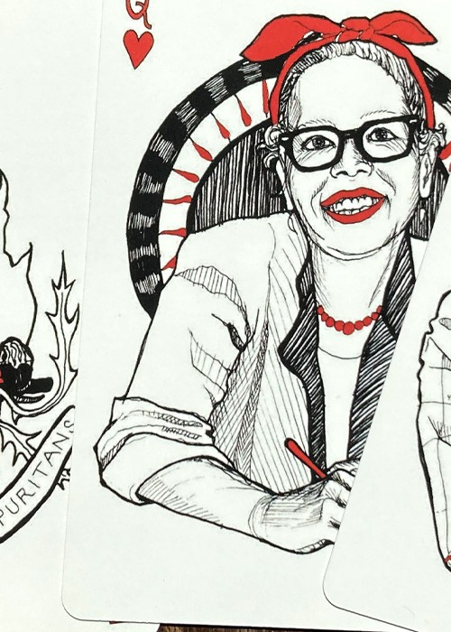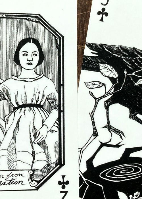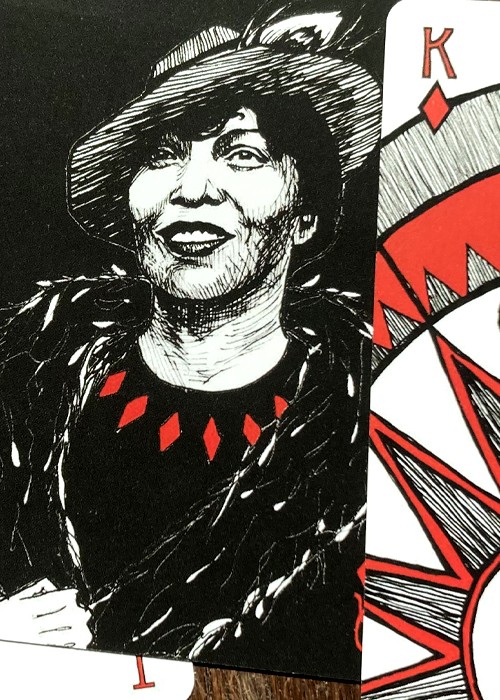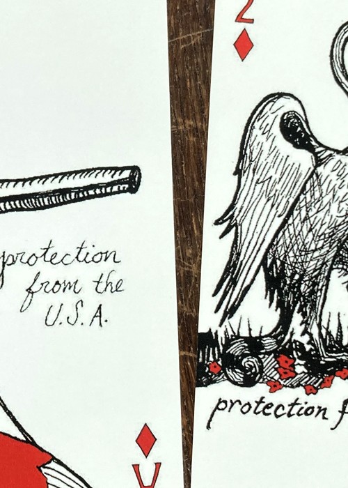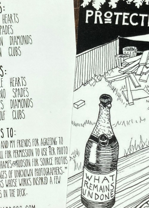 A wonderful deck of brilliantly conceived and rendered cards, described as “protective playing cards.” The court cards depict specific individuals, but otherwise, each card states on its face that it provides protection from one of life’s threats, stressors, etc. These cards are terrific. It is impossible to say too many good things about them. Take the Jokers, for example. The Jokers are “complementary” in the sense that they relate to each other in a very clever and profound way. One Joker shows a pelican framed by an idyllic ocean setting with the words, “Protection from Delusions,” while the other Joker shows the same pelican victimized by an oil spill and other environmental degradation in the ocean with the words, “Protection from Crippling Despair.” Almost every card offers this kind of thought provoking insight. The deck is smart, affecting, humorous, touching, and hip. The deck has 52 suited cards, plus 2 Jokers, plus an extra card that offers “Protection from What Remains Undone.” In addition, there is an extra card that identifies the persons depicted on the court cards, including Herman Melville, Walt Whitman and Virginia Woolf.