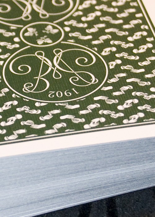 These are an updated edition of one of our best selling (and sold out!) decks featuring some alterations to the design for aesthetic as well as deceptive purposes. The cards feature a modified Acorn back design in green, with faces representative of the 1902 period. Those who have purchased decks from us in the past will be pleased to hear that we have not only retained the very high quality of previous editions but believe we have surpassed it! These cards are printed on the web press using the casino paper. Then they went through a special finishing process to create a thin, strong, and very springy playing card. They are in a Cambric finish, and, as is our custom, we also have them available in Ivory finish by request. Use them based on your preferences, or combine them for nefarious purposes! Additionally we have had them cut the same way that Richard Turner has his cut, so they shuffle and faro extremely well. We have gone to great lengths to make these the best cards you have ever handled, even considering the upcoming summer weather and factoring in the possible heat and humidity! Available in Cambric and Ivory finishes