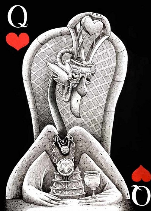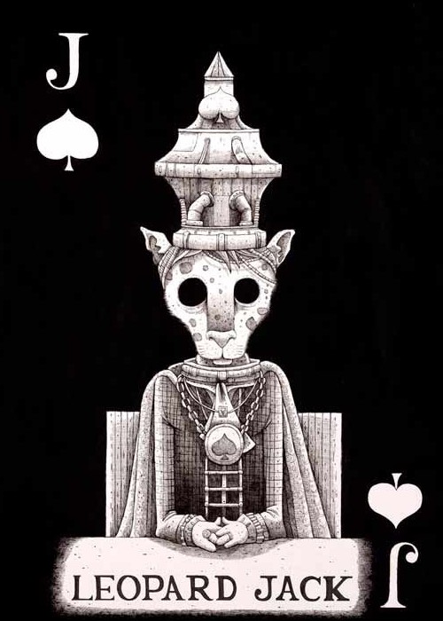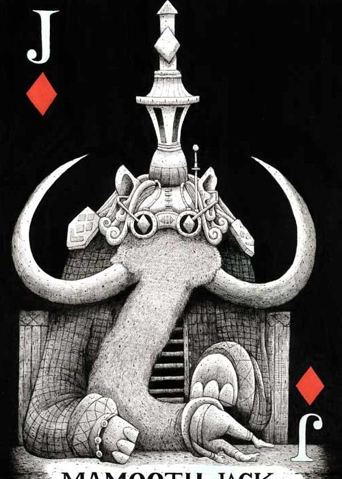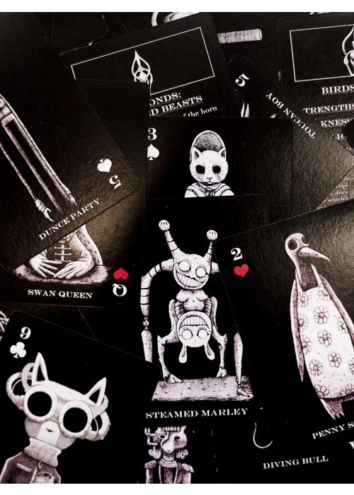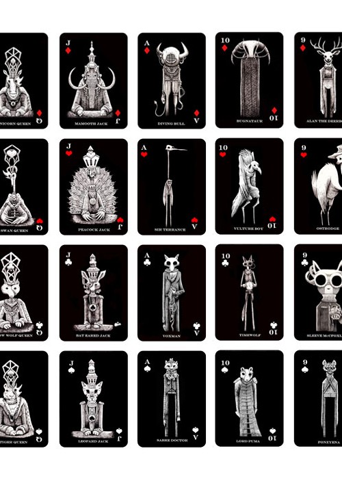 This deck features weirdly wonderful bio-mechanical anthropomorphic creatures from English artist Mr. Mead who channeled his childhood fear and obsession with anthropomorphism. The characters are grouped by family into the four suits, Birds for the Hearts, Horned Beasts the Diamonds, Cats the Spades and Foxes the Clubs. A total of 4 versions were printed in 6 runs of 100 each.  Each version uses the same cards, but a different tuck for each version.  Initially released in April 2011 as v1 with 100 decks using a tuckbox featuring a rat head and Antlers Gallery ‘A’ logo on the back, as they were sold by antlersgallery.com only or at the gallery reception event.  Shortly after a 2nd version was printed using the Diving Bull (AoD) on the tuckbox with 100 more decks.  This was followed by another 100 printing as v3 using the Voxman (AoC) on the tuckbox.  Finally the v4 in 3 print runs of 100 each using the foxhead logo, also known as the ‘artist edition’.