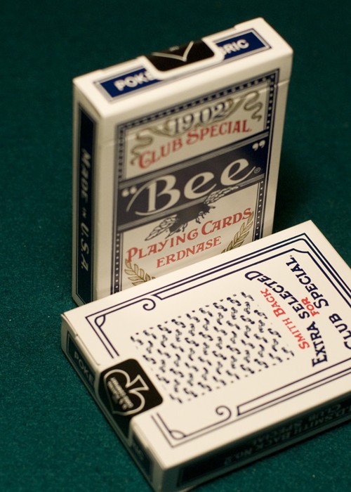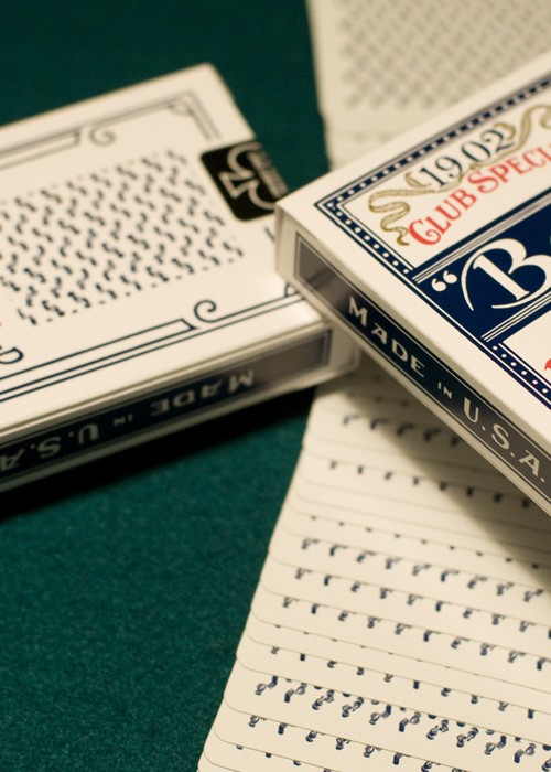 Conjuring Arts is incredibly pleased to offer the fifth version of the Erdnase 1902 brand cards. The Smith No. 2 Blue design is exceptional. This white and blue deck is a unique hybrid design that can be used for gambling routines and sleights, as well as effects that require or benefit from white Bordereds. These commemorative decks, designed by Guy Hollingworth (with additional face artwork by Dan White), are printed on exclusive Bee Casino paper and are made with a special coating to ensure the best handling. They’ve been cut the same way as Richard Turner has his cut so they faro and shuffle extremely well. These are actually our best handling cards to date. If you loved the last decks, the Smith No. 2 Blue will blow you away. This Smith No. 2 Blue Deck is named Smith in honor of Marshall D. Smith the illustrator of The Expert at the Card Table. The overall Bee-like pattern is actually made up of tiny reproductions of the hands in the illustrations of the great card classic (click on the image to the left). Where before the background was colored in black, and then in red, for our original Smith cards, the Smith No. 2 design has a white back with blue illustrations of the hands. The color reversal is dramatic, and the cards are just as great to work with as the earlier decks, cambric or ivory finish. You must send an e-mail to us with your order if you would like Ivory decks, otherwise we will send your order in cambric. This is our first deck in one of the traditional blue colors, presented to you in a dynamic, exciting design. These decks also use the original faces used by U.S. Playing Card Co. in 1902. These great faces have somewhat larger pips and somewhat smaller indices which combine to create an unusually attractive face. The head playing card researcher of US Playing Card Co. supervised all aspects of production of these cards, including overseeing production of printing the backs, embossing, crushing and the final cutting and casing at the U.S. Playing Card Co. factory. We truly believe that we’ve made the finest cards that US Playing Card can produce at the present time. The cards were printed in a very limited quantity and there is no guarantee that they will be re-printed. If you need some of these to perform with, practice with, or add to your collection, this is the time to get them.