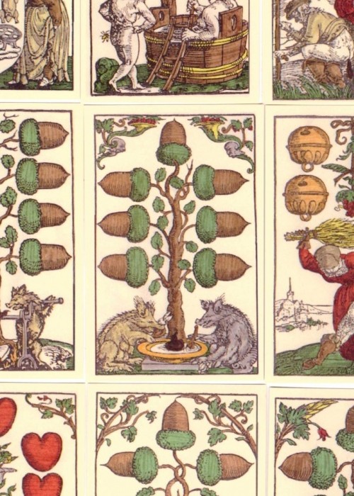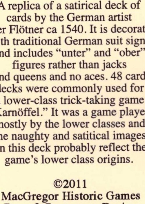 Replica of the 1540 deck by Peter Flötner as created by Rose & Pentagram Design in 2011. This deck was created in Germany and is nicknamed the poop deck by some historical hobbyists due to the content of some of the satirical cards which make fun of the bourgeois way of life. It includes several satirical images such a monk vomiting, scenes of farting, spanking and excrement. This 48 card deck used traditional German suits as well as unter and uber figures rather than jacks and queens, and omits aces. It was likely used for the lower class trick taking game Karnoffel which explains the images shown.