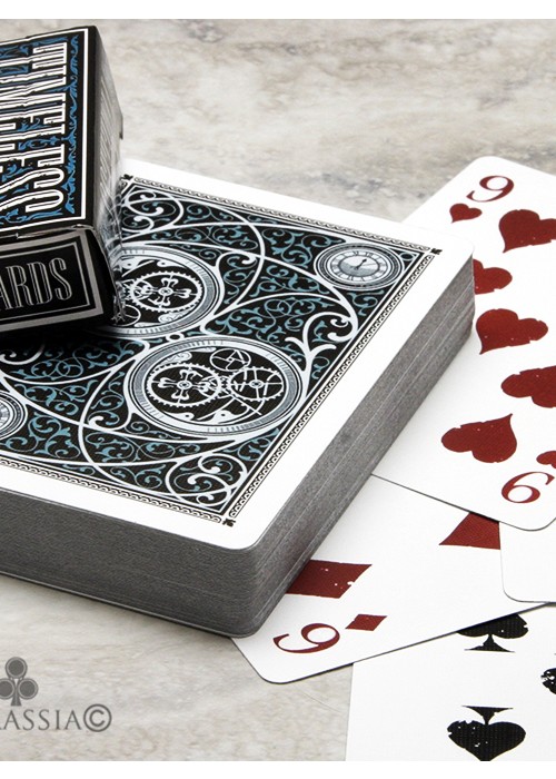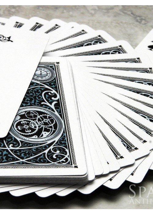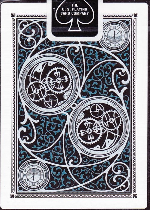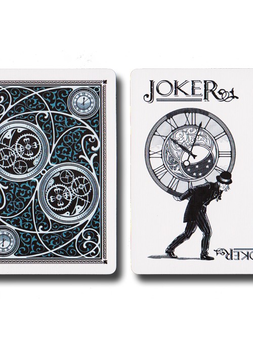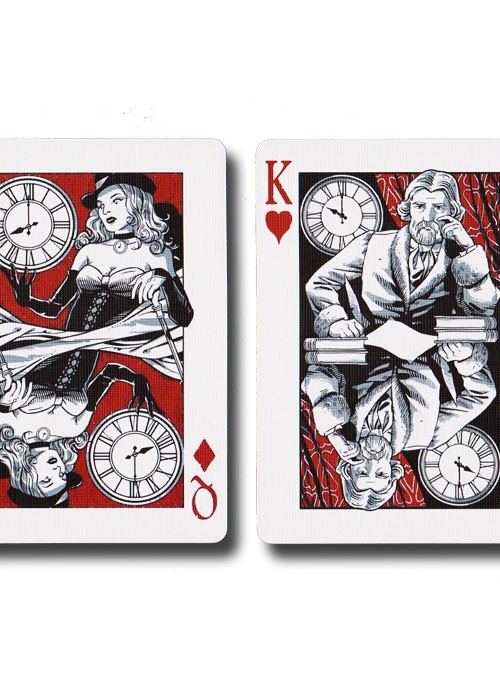 Scans of each card can be seen atwww.marytcusack.com/maryc/Cards/Timeless.html Timeless is another release by RSVP Magic and features early work from designer Lotrek of Half Moon Playing Cards. A really sharp fully custom deck with a well designed back that lends itself well to the theme and keeps a two way back design dynamic. The deck also features slightly stylized pips, custom Ace of Spades and only one Joker. The deck also comes with two gaff cards and a double backer for some nice effects. Note the two images of the King of Hearts below…very subtle. Built into this very special deck are the following unique features: Each custom designed court card depicts a different hour of the day and these have been printed in ‘Chased’ order allowing for some superb effects that are unique only to this deck. Ideas are limited only by your imagination. Includes one custom designed Joker, a duplicate King of Diamonds with a different time feature that allows for the effect of moving a time to the predicted one, a duplicate Jack of Spades with a broken clock face and one double backer.