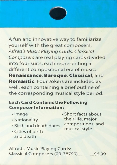 The deck has 52 different composers, each with a short biography, an artwork of the composer, and vital statistics. The cards have standard indices, but no pips. Each suit consists of composers of one of four styles. Spades is Renaissance; Hearts is Romantic; Clubs is Baroque; and Diamonds is Classical. There are four jokers with stylised joker figures in green in the top left and bottom right corners, and an explanation of each style. There is one more card explaining the deck a little. This deck contains a large amount of words. The backs of the cards are two-way with an abstract design in blue and green. The cards are smooth.