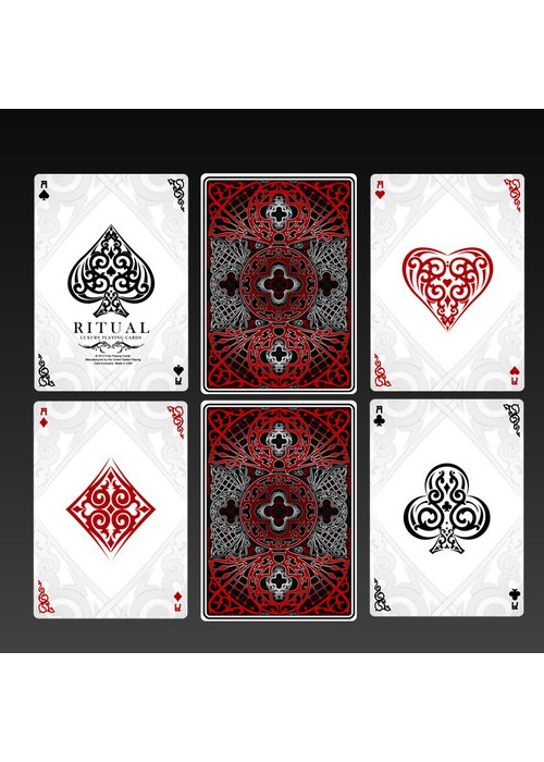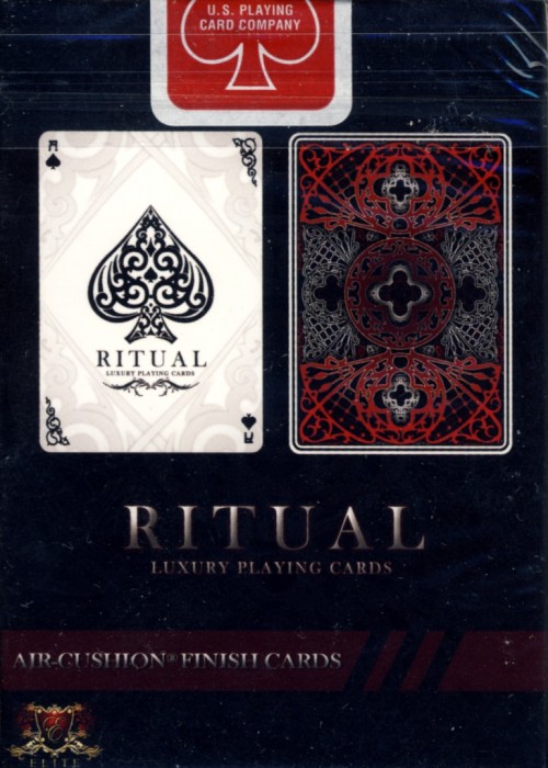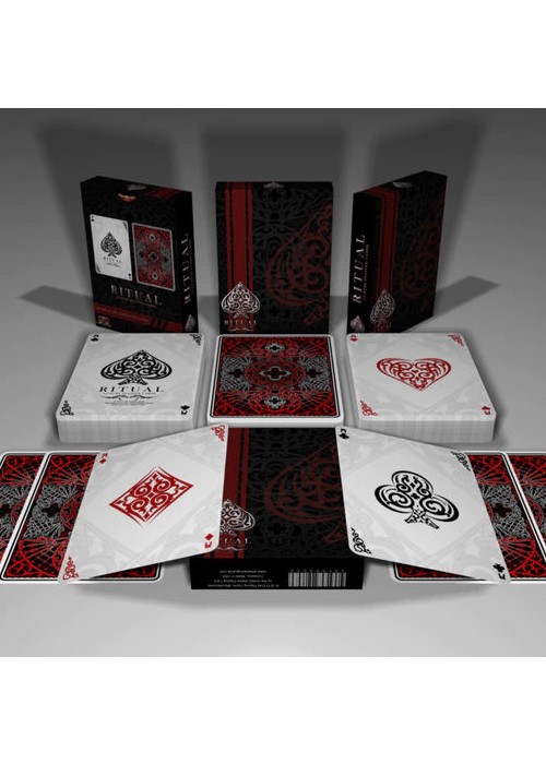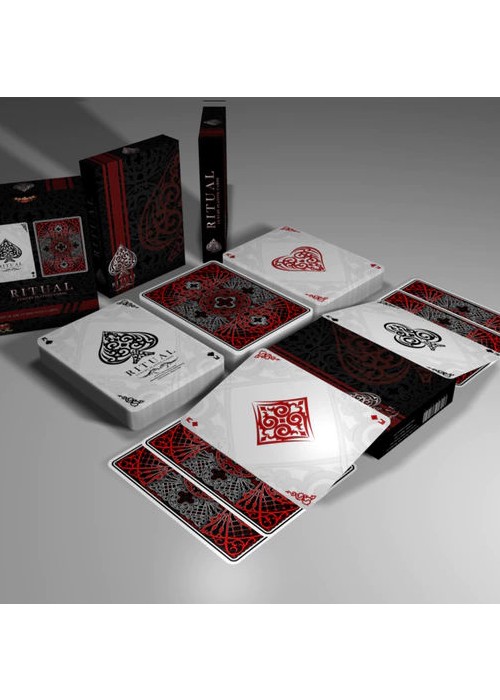 Finally a deck of cards that is inspired by the origins of magic. Holding one of these decks is holding part of magic’s history, and a legacy with over 5,000 years. Ritual is designed by Elite Playing Cards and is the first of a new line of luxury cards. Ritual Playing Cards Feature list: The deck features 100% original art: faces, backs, court carts, box, and even the pips. Exquisite attention to detail. Printed in Bicycle card stock Magic air cushion Finish Custom backs Custom pip designs Custom court cards Custom Jokers Custom tuck box Gaff card Magician Friendly barcode reveal Every little detail has been painstakingly designed to ensure that each deck is truly a work of art. Whether you’re a Cardist, Collector, Magician or just want a high quality deck for your poker games, Ritual is a deck that is sure to offer durability, tradition, and elegance.