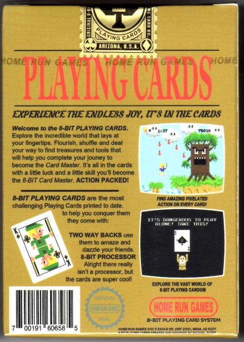 Although similar to the 8-Bit Gold Edition, there are slight differences — most notably, the lack of a Bicycle logo, the custom gold deck seal, and the die-cut cover that allows the back of the card to show in the upper left corner of the shield. The deck pays tribute to 1980’s video game systems and is meant to take players back to the good old days of 8-bit gaming. The court cards have awesome pixel characters and there are hidden retro gems throughout the deck. The deck contains 56 cards in total, which includes 52 playing cards, 2 jokers, 1 double-back, and 1 gaff card. Full Deck Scan: https://cardscans.piwigo.com/index?/category/132-8_bit_playing_cards_gold