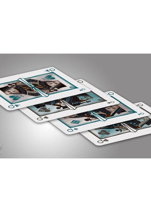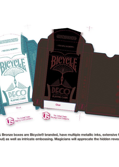 Card Details: – Deco will be a limited 5,000 deck production by the US Playing Card Company. They will be sold in a pair, 2,500 sets total. It will not be reprinted or released again. Most major deck releases are printed in the tens of thousands, so Deco will be a guaranteed rarity from the start. – The cards will be on the highest-end Bee Casino stock with the excellent Magic finish. They will handle at the supreme top-end of the playing card scale. When you bring these out at your next poker game all your friends will notice how great they shuffle. – Deco Silver will be the light deck, with metallic silver, rich blue and white tones. Deco Bronze will be the dark deck, with warm near-black colors, metallic red and metallic bronze. – Deco has unique 90-degree four corner pips, carefully designed to assist with identifying cards when playing card games as well as adding visual detail during card flourishing or magic. – Deco will feature many elegant, hand-crafted details. Metallic inks add shimmer and depth and the deck is housed in a beautiful foil and embossed tuck box.