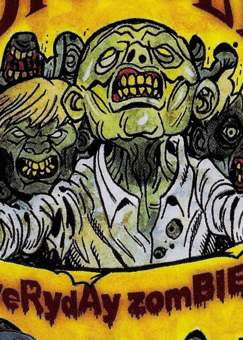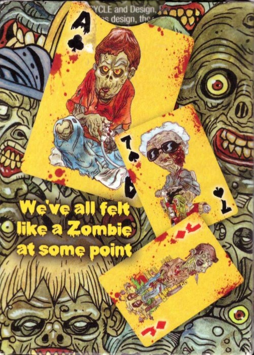 Unlike an earlier Bicycle zombie pack which offered tips on how to avoid a zombie attack, this Bicycle pack, published in 2013, simply displays full-length colourful and imaginative zombie cartoon figures on each of the 54 cards. The artist is Rob Sacchetto, a freelance illustrator, painter, and visual artist. He has worked in a variety of mediums including film, television, and comic books, and has been illustrating custom zombie portraits full-time since 2006. Full Deck Scan: https://cardscans.piwigo.com/index?/category/781-bicycle_everyday_zombies