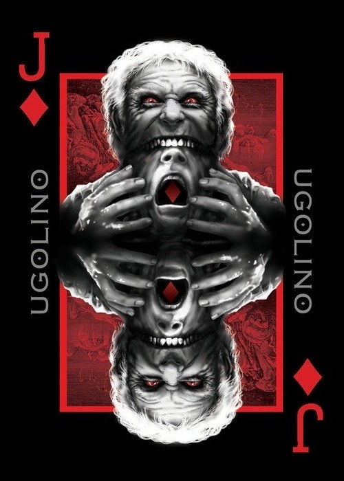 The Inferno is a customized 56 card black and metallic ink playing card deck printed by USPCC and Inspired by Dante Alighieri’s literary classic The Divine Comedy. Three months in the making, each of the Jacks, Queens, and Kings represents a major figure from The Inferno. Each completely original character was designed as a modern interpretation that is true to the text and framed after the most famous Inferno Illustrations created by renowned artist Gustave Dore in the 19th Century. Staying true to that vision, we have created images utilizing the original Dore plates for our backgrounds.