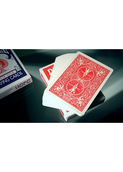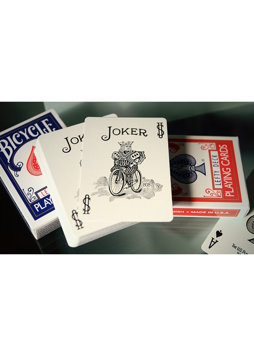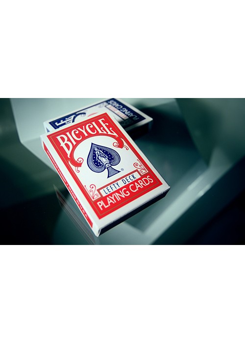 The Lefty Deck was originally conceived and created by Kevin Reylek through his company New York Magic Project. There was a 5,000 deck print run made in 2008 in Red Backs only (https://www.portfolio52.com/deck/8870/view). In 2013, a reprint in conjunction with HOPC was done in Red and Blue backs. This edition is easily distinguished from the first edition by the HOPC info on the bottom flap. Standard, with Lefty Deck printed in typical Rider Back text location. Bottom flap has HOPC info that distinguishes it from First Edition.