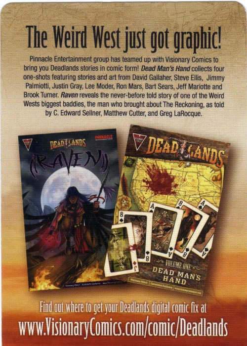 Add-on playing card deck from the Deadlands: Raven Graphic Novel Kickstarter campaign https://www.kickstarter.com/projects/visionaryworlds/deadlands-raven-graphic-novel/description No tuckcase