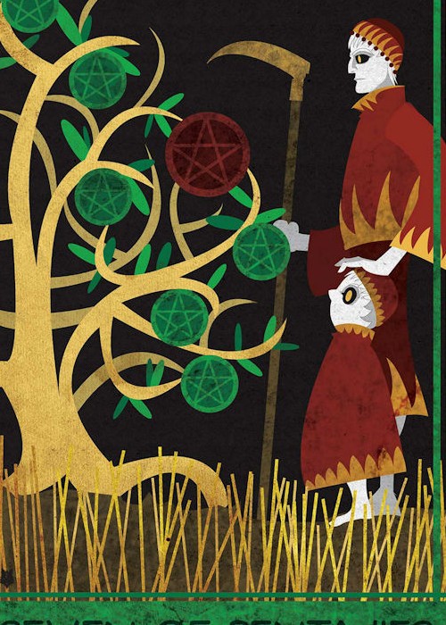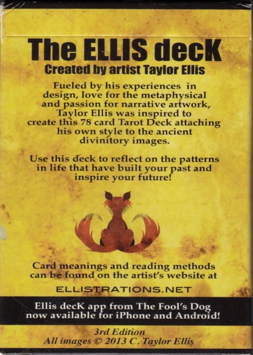 Scans of each card can be seen at www.marytcusack.com/maryc/decks/html/Tarot/Ellis.html The Ellis decK has 78 cards composed of digitally-collaged shapes with a colourful sense of emotion and mystery. The art is uniform across the deck, and focuses more on clear interpretation than dense symbolism