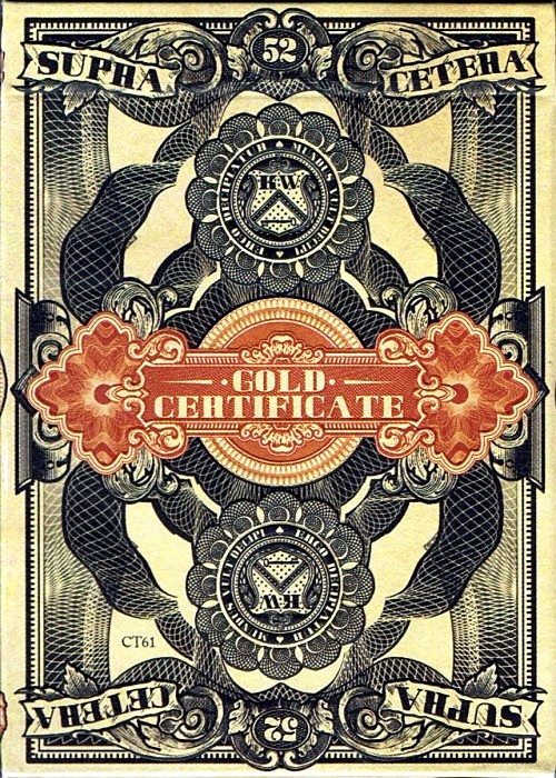 The Gold Certificate deck is the second deck released in the Federal 52 series. Inspired by US Gold Certificate Bank notes of the late 1800s and early 1900s, the Gold Certificate deck features new, hand-drawn renditions of the presidents and other key figures found on US currency.
