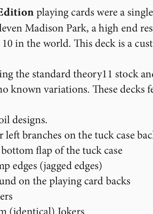 Monarch Eleven Madison Park Edition playing cards were a single production run with an original tax stamp (jagged) seal and then a replacement smooth seal when the small inventory of tax stamp seals became unavailable at the time. There is only a V1 edition since the tuck box design and playing cards are identical, but rather the small number of jagged tax stamp seals were used first and then the more abundant and available smooth seals were used second when the jagged tax stamp seals were temporarily unavailable . Monarch Eleven Madison Park Edition playing cards were a single-printing limited-edition product not ever sold on theory11.com. These were printed specifically for Eleven Madison Park, a high end restaurant in New York City that was ranked #1 in the world in 2017, and is consistently ranked in the top 10 in the world. This deck is a custom variation based on Silver Monarch playing cards. Eleven Madison Park Edition playing cards were a single production run with an original jagged seal and then a replacement smooth seal when the jagged seal inventory ran out of stock (see picture of T11 VP of Operations Comments).