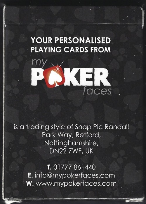 52 card, 2 jokers and an additional order card. www.mypokerfaces.com will print a single deck of cards from your own photographs. 55 images, including one back design, the photos are Borderless (Full Bleed). Satin finish on both sides. The compant are no longer in business. Produced for my fiftieth birthday, on;y one deck in existence.