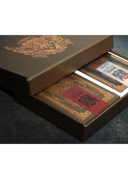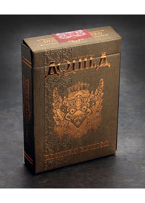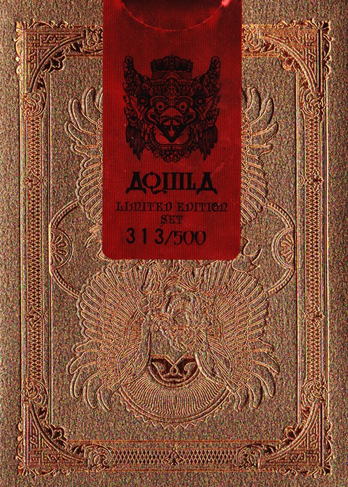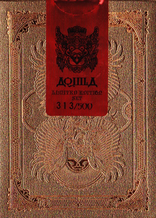 Funded as a Kickstarter project on May 23, 2014 with $27,421 pledged from 588 backers, this was a two deck set consisting of both a Standard and Limited Edition. Designed by Ade Suryana and produced by Kardify Projects, this deck features the theme of Aquila (Latin for eagle) which was inspired by the Garuda Wisnu Kencana in Bali, Indonesia, that is a large mythical bird with eagle-like features has been featured in many cultural and religious mythologies. This PCDB Entry is for the Limited Edition Serial Numbered deck. Aquila Serial Numbered Box Sets – Include 1 Standard Edition and 1 Limited Edition with Holographic Serial Numbered Seals, matching Serial Numbered Custom Box and Matching Certificate of Authenticity. ONLY 500 Sets were produced. https://www.kickstarter.com/projects/kardify/aquila-playing-cards Aquila also tied for winning the Best Pips award from UnitedCardists 2014 Deck of the Year http://unitedcardists.com/viewtopic.php?f=8&t=6448