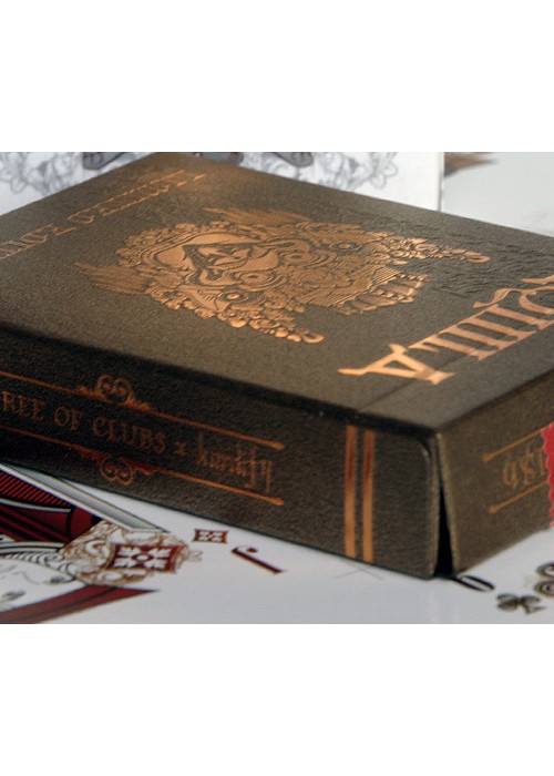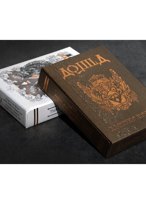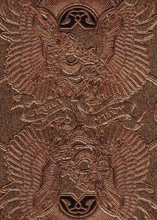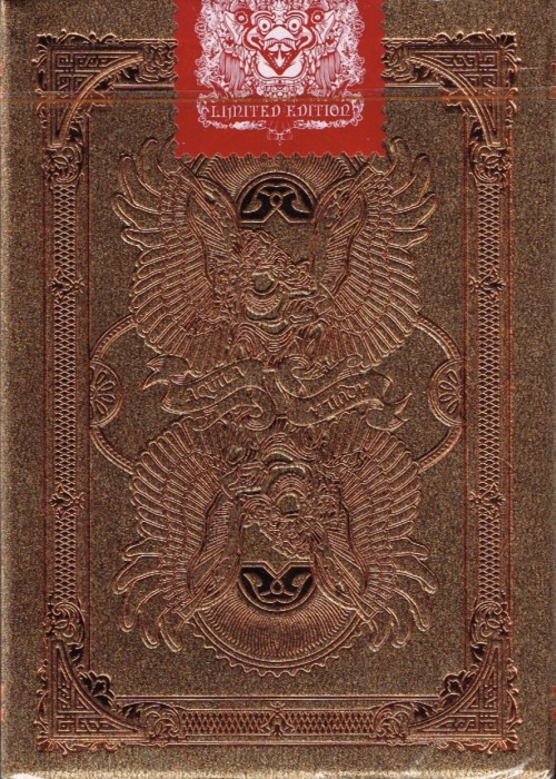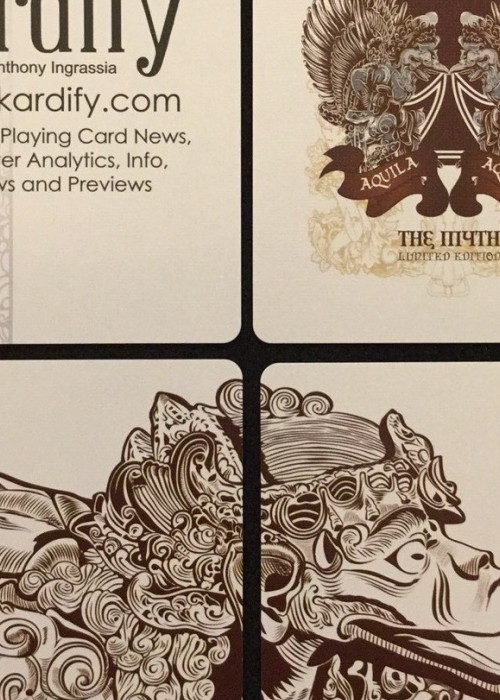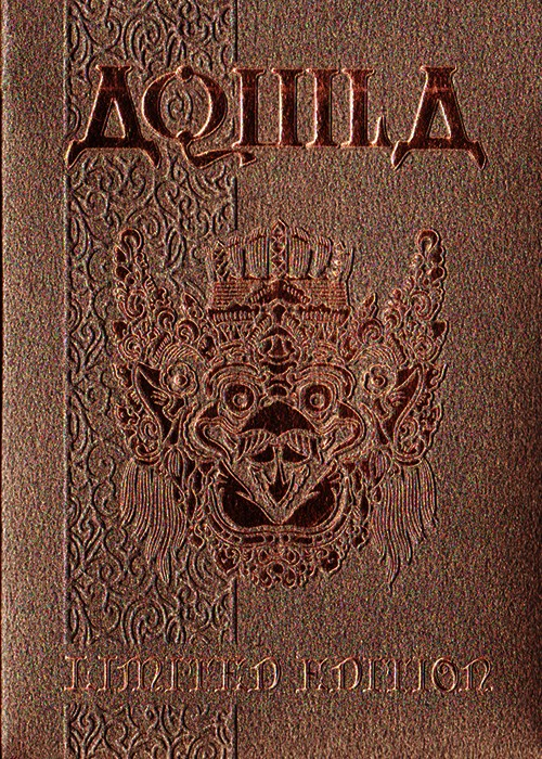 Funded as a Kickstarter project on May 23, 2014 with $27,421 pledged from 588 backers, this was a two deck set consisting of both a Standard and Limited Edition. Designed by Ade Suryana and produced by Kardify Projects, this deck features the theme of Aquila (Latin for eagle) which was inspired by the Garuda Wisnu Kencana in Bali, Indonesia, that is a large mythical bird with eagle-like features has been featured in many cultural and religious mythologies. This PCDB Entry is for the Limited Edition deck. https://www.kickstarter.com/projects/kardify/aquila-playing-cards Aquila also tied for winning the Best Pips award from UnitedCardists 2014 Deck of the Year http://unitedcardists.com/viewtopic.php?f=8&t=6448