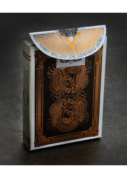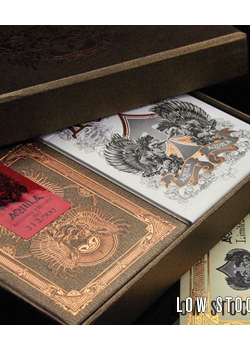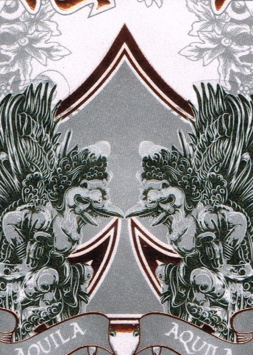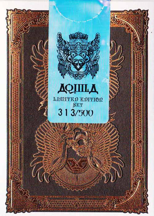 Funded as a Kickstarter project on May 23, 2014 with $27,421 pledged from 588 backers, this was a two deck set consisting of both a Standard and Limited Edition. Designed by Ade Suryana and produced by Kardify Projects, this deck features the theme of Aquila (Latin for eagle) which was inspired by the Garuda Wisnu Kencana in Bali, Indonesia, that is a large mythical bird with eagle-like features has been featured in many cultural and religious mythologies. This PCDB Entry is for the Standard Serial Numbered deck. Aquila Serial Numbered Box Sets – Include 1 Standard Edition and 1 Limited Edition with Holographic Serial Numbered Seals, matching Serial Numbered Custom Box and Matching Certificate of Authenticity. ONLY 500 Sets were produced. https://www.kickstarter.com/projects/kardify/aquila-playing-cards Aquila also tied for winning the Best Pips award from UnitedCardists 2014 Deck of the Year http://unitedcardists.com/viewtopic.php?f=8&t=6448