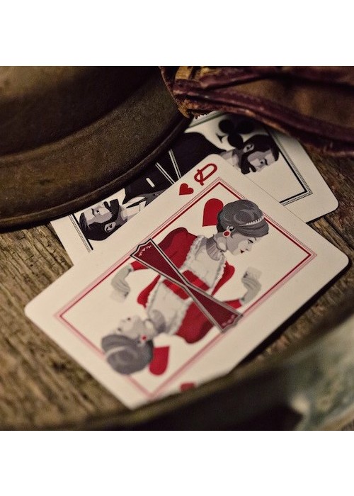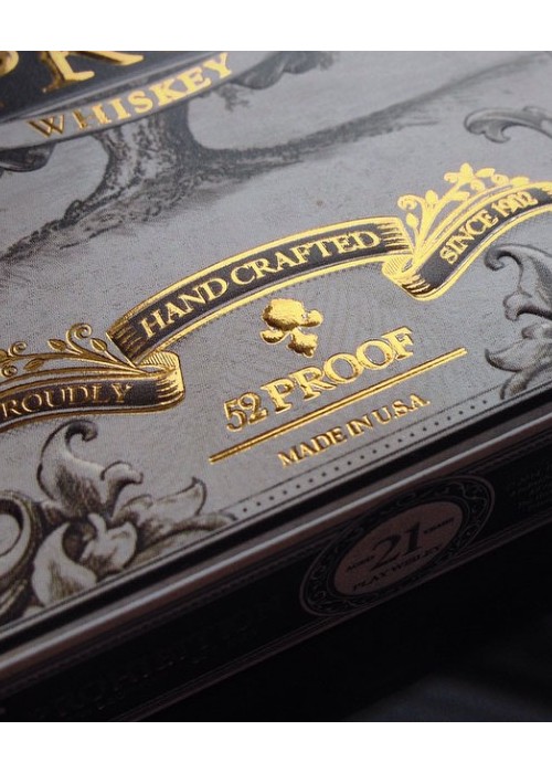 52Proof Whiskey is as American as apple pie. The giant oak tree on the front of the tuck box and seal a symbol of the aging process for fine bourbon, matured in charred oak barrels to develop the distinct smoky flavour. This oak motif continues throughout the cards, from the Ace of Spades right around to the back design. While bars before prohibition were predominantly male domains, in the 1920’s many women flocked to speakeasies in their best flapper attire. We’ve taken inspiration from images of the era to design the court cards, the art-deco look very in-vogue at the time. The Gold Foil stamping on the outside of the tuck and luxurious red satin-finished interior makes 52Proof one of the most gorgeous boxes we’ve ever produced – and it’s only available in the Prohibition Box Set.