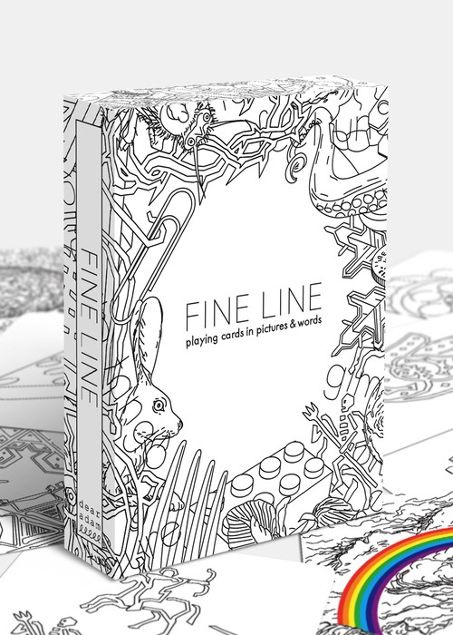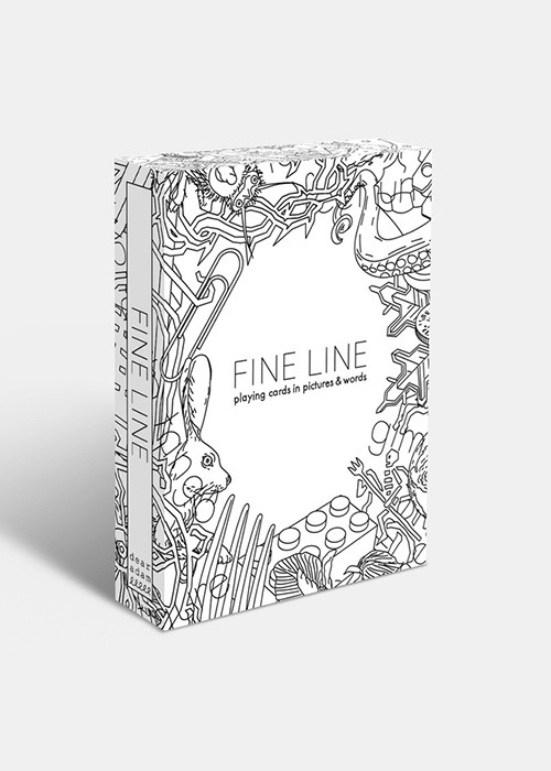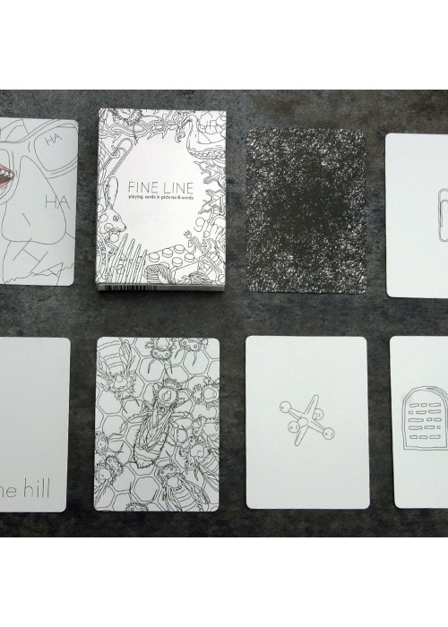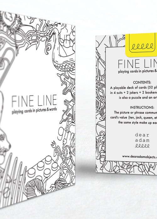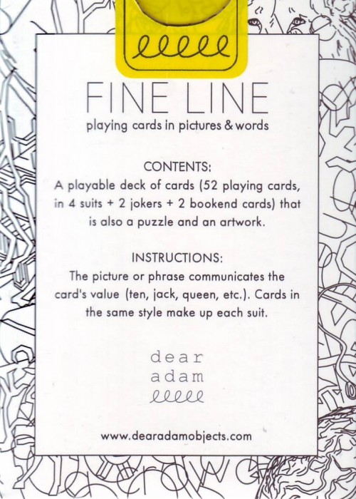 Each of the cards features an illustration or phrase that depicts the card’s value and suit in a new and surprising way. For example: An octopus depicts one of the eights. A lion is one of the kings. The ten commandments is one of the tens. For the suits, we’ve created four distinct families of illustrations or phrases. Each thirteen-card family has its own style and theme. Cards that go together in a family make up each suit. We’ve also created two very special and unusual jokers. That’s all we’ll give away! The rest is for you to figure out!