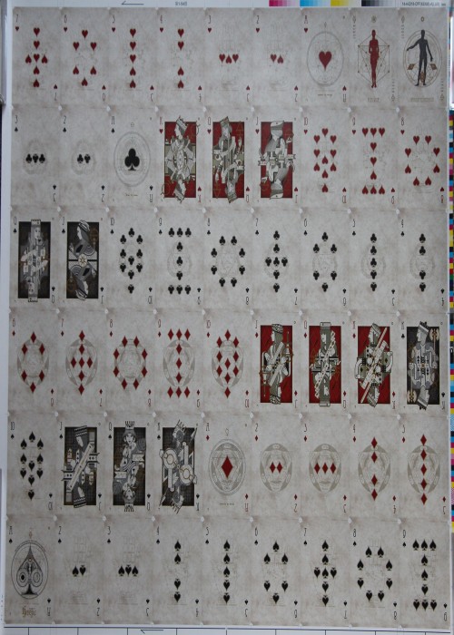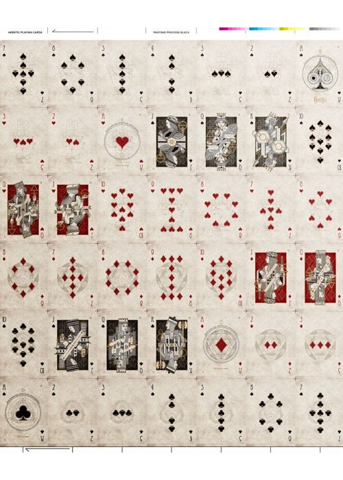 Heretic Playing Cards by Lorenzo Gaggiotti (Stockholm17) is based on alchemy and the hermetic world. Salt (for the Jacks), Sulfur (for the Queens) and Mercury (for the Kings) are the three basic ingredients of the alchemist. This PCDB entry is for the uncut Lux version of the deck, there also was a Noctis version and standard decks of each. In addition, there was a VERY limited subset of both Lux and Noctis that were signed and wax sealed called Heretic Gran Riserva.