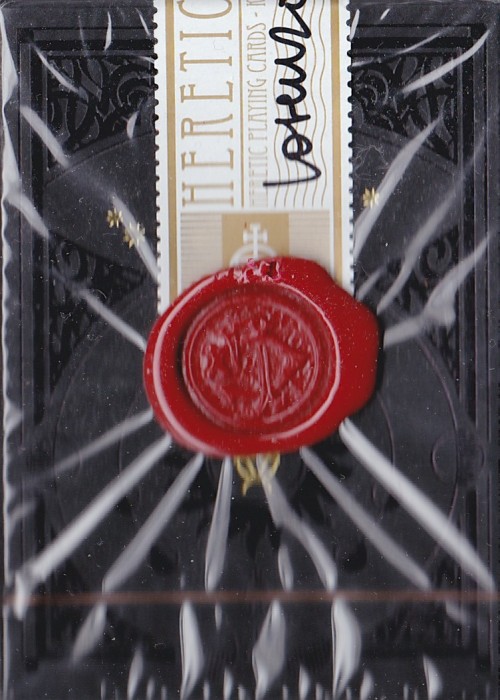 Heretic Playing Cards by Lorenzo Gaggiotti (Stockholm17) is based on alchemy and the hermetic world. Salt (for the Jacks), Sulfur (for the Queens) and Mercury (for the Kings) are the three basic ingredients of the alchemist. This PCDB entry is for the Noctis version of the Gran Riserva edition, Salt class (just X serialized decks made with this class seal). Each deck in each class for the Gran Riserva editions have a custom printed seal for each class, plus a wax seal and signed by the artist. Other classes available in the Gran Riserva edition were classes for Sulfur, Salt and Antimony (for both Lux and Noctis), each with different quantities made. These are the tuck and cards as the basic versions of Lux and Noctis, but with the added seals and signed. In addition, there was also the basic versions of both the Lux and Noctis decks, plus uncuts of each. https://www.kickstarter.com/projects/requiemcards/heretic-playing-cards