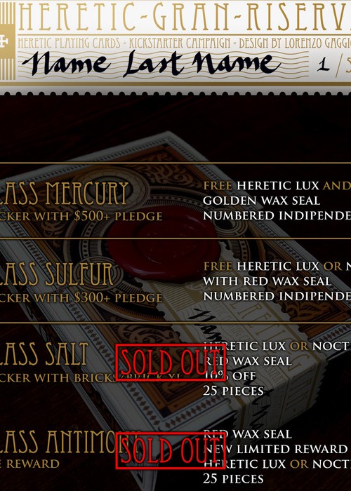 Heretic Playing Cards by Lorenzo Gaggiotti (Stockholm17) is based on alchemy and the hermetic world. Salt (for the Jacks), Sulfur (for the Queens) and Mercury (for the Kings) are the three basic ingredients of the alchemist. This PCDB entry is for the Noctis version of the Gran Riserva edition, Sulfur class (just X serialized decks made with this class seal). Each deck in each class for the Gran Riserva editions have a custom printed seal for each class, plus a wax seal and signed by the artist. Other classes available in the Gran Riserva edition were classes for Sulfur, Salt and Antimony (for both Lux and Noctis), each with different quantities made. These are the tuck and cards as the basic versions of Lux and Noctis, but with the added seals and signed. In addition, there was also the basic versions of both the Lux and Noctis decks, plus uncuts of each. https://www.kickstarter.com/projects/requiemcards/heretic-playing-cards