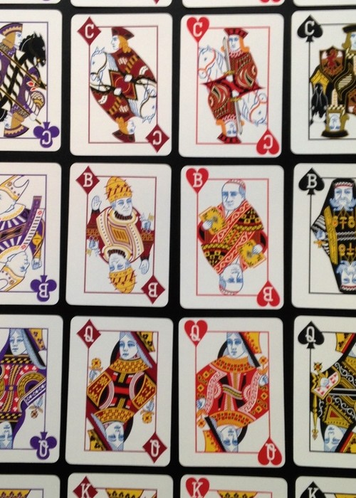 Also known as the demo deck, this is an early prototype of a 2015 Kickstarter campaign which was cancelled, which was a relaunch of an earlier campaign which failed to fund (https://www.kickstarter.com/projects/russellcommon/texas-playing-cards-where-pocket-kks-are-really-ki). Produced by Russell Common of Texas Playing Cards (texasplayingcards.com) this deck had 101 decks printed by MPC for this prototype purpose on 310 GSM Casino stock. Some custom artwork, including the 4 jokers was done by artist Vivian Friedel (http://haggardhare.com). It is a variation of a standard poker deck that creates a 64 card deck by adding a Joker for each suit, plus adds an additional pair of court cards for each suit called the Cavaliers and Bishops which fit between the 10 (aka Tower in this deck) and Queen, in that order (T, J, C, B, Q, K). In terms of game play, the Jack is worth 11, Cavalier 12, Bishop 13 and Queen/King move to 14/15. The deck also places the card rank index inside the suit. The Bishops in the deck were inspired from past popes of the Catholic church. The tuck itself is styled after a famous cigaratte box, complete with related warnings. While the back design is meant to be a visual illusion of sorts.