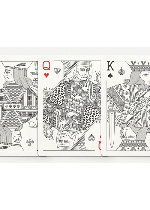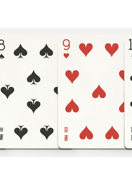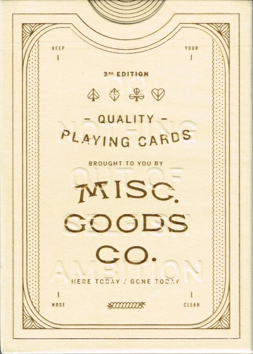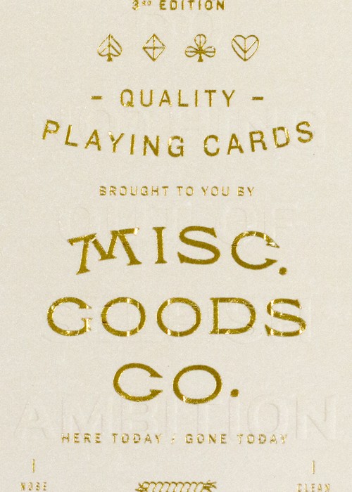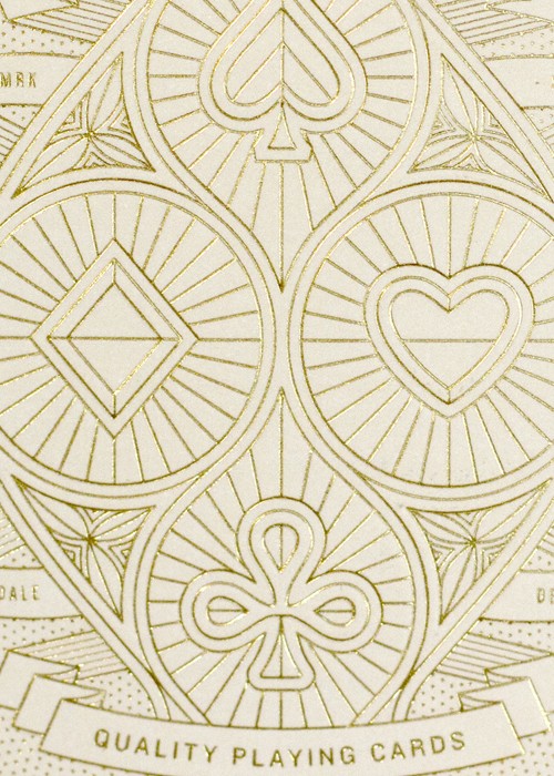 The deck is manufactured by the United States Playing Card Co., and is printed on Bee paper, the highest quality coated playing card stock. The tuck case is printed with ivory ink, gold foil and is embossed.