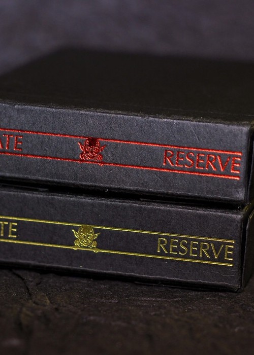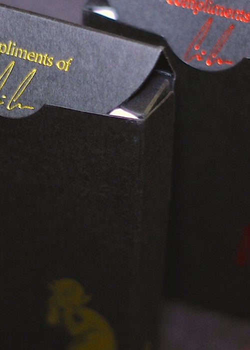 The Private Reserve decks are the true, original vision for the Whispering Imps® playing cards created by Chris Chelko, hand illustrated by world renowned artist Mark Stutzman and printed to exact specifications by The Expert Playing Card Company. Two versions of the Private Reserves were printed for Whispering Imps Productions in extremely limited quantities. The classic back design in Imp Red, housed in a thick matte black paper tuck and stamped with the trademark Whispering Imp in Bright Red foil, and the classic back design in Black, housed in a thick matte black paper tuck and stamped with the trademark Whispering Imp in Gold foil. The Private Reserve decks were printed in response to the Original & Special Edition decks being completely sold out and with the intent to remain a true, private reserve. Never to be sold and for the private use of those who have acquired them. Features: Perfect Bordered Registration Thin Bordereds Newly Discovered & Remastered Pre-1900’s Court Cards Ace of Spades marked with Private Reserve Jokers marked with Private Reserve Tuck Box: Premium Thick Black Matte Finish: Premium Embossed Paper Stock with Expert Finish Quantity: 1000 (Red Back
