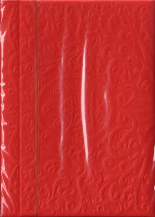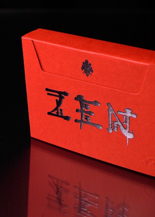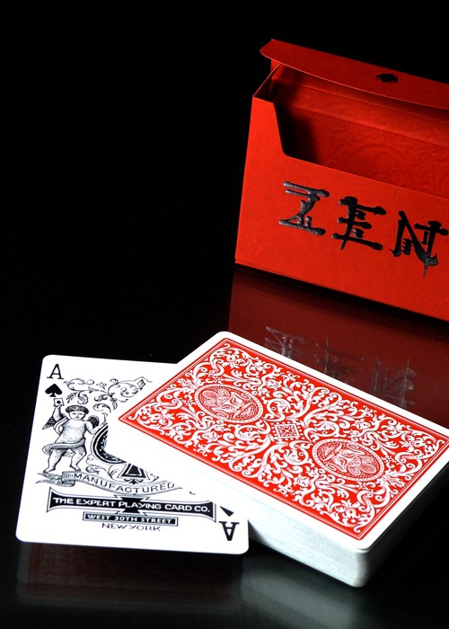 Experimental prototype Red Zen deck from the Expert Playing Card Company. Expert is always pushing the boundaries and experimenting with new techniques, and the red Zen is the latest experiment. In the never-ending effort to create the perfect deck we have changed the chemistry of the coating and the Zen is a little different. It’s a fully produced offset (not a low-end digital proof) deck with all the features. Expert made a batch to try the new technology and will not release them for sale. The tuck is our Expert Playing Card Co.’s sideways shape and is made of premium embossed red stock and stamped with black foil.