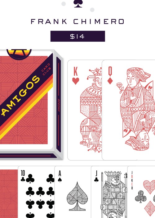 Funded as a Kickstarter project on November 9, 2014 with $33,851 pledged from 1,017 backers, this was a selective 3 deck project. Each of the 3 decks were designed by different artists: Jessica Hische (cat theme), Frank Chimero (line art), & Alonzo Felix (space theme) and was created by Fictive Kin. The decks were printed by Expert Playing Card Company.