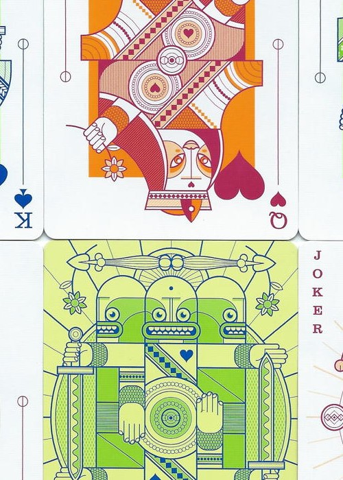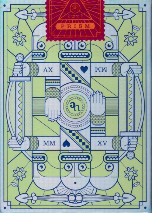 Funded as a Kickstarter project on December 1, 2014 with $11,686 pledged from 346 backers, this was a 2 deck project consisting of the standard Delirium (Prism) deck and a Signature Edition, plus uncut format. Designed by Giovanni Meroni through his TWI (Thirdway Industries), this deck features a fun cartoonish look of with intricate and modern style, strongly inspired by the classic french playing cards, but with crazy twists. The deck was printed by Expert Playing Card Co. using their Master Finish.