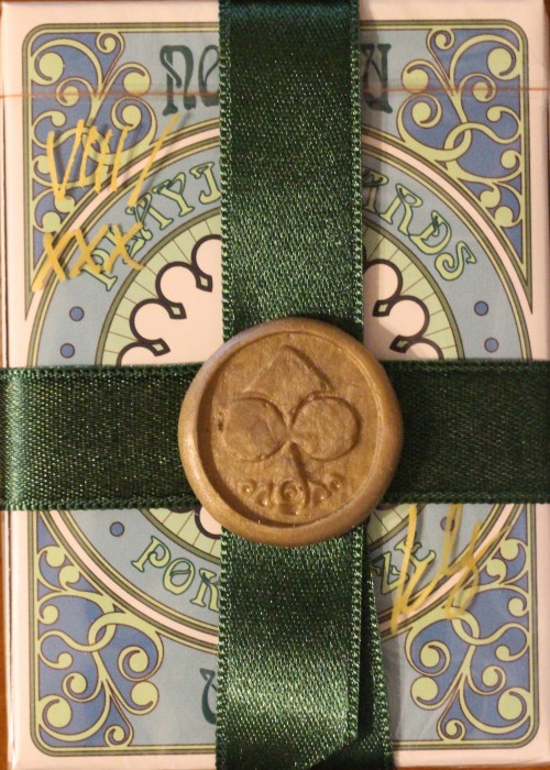 UC GRAN RISERVA Special Edition produced exclusively for United Cardist community. Exclusive additions included Di-cut Card Case and a deck which is tied off with ribbon and wax seal. Tuck is signed and numbered with Roman Numerals on top of cellophane. The Nouveau & Bourgogne Gran Reserva decks tucks are constructed with heavy card stock laser cut by Steve at Clearcut Creations in Britain, and include a COA card and five extra Spanish suited cards unique to these ultra limited edition, printed by MPC on their awesome new 330gsm German card stock made by Chromolux.