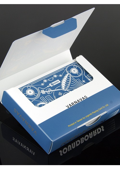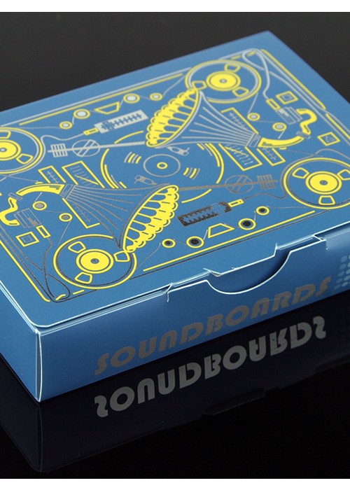 Conceived by the talented card flourisher Patrick Varnavas and illustrated by Stuart Palm, we are very excited to introduce SOUNDBOARDS. Designed to emulate a cassette box case, we engineered a flexible synthetic tuck box with a sturdy plastic window to hold each deck of Soundboards.