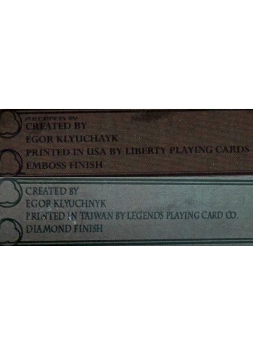 This deck was originally a KickStarter project which was cancelled with the intent to print with Legends Playing Card Company and later funded directly by Gambler’s Warehouse and actually printed by Liberty Playing Card Company. Perhaps as a result, some early decks incorrectly listed the printer as Legends, but it seems most correctly had them listed as Liberty.