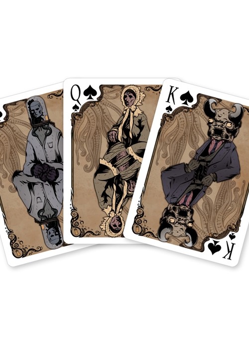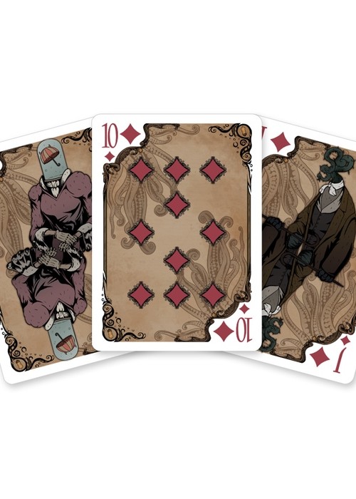 To deal a deck dandy To play a card cruel Gaslight macabre— Caressed by Cthulhu Welcome to the Strange Head Society, where the intrigue of classical science-fiction blazes the boilers of grim steampunk style—or shall we say deportment? While all manner of science and theory are discussed at Strange Head convocations, no gathering would be complete without a high-stakes game of cards, be it Euchre, Poker, Cribbage, or Hearts. To commemorate this deep tradition, cardist and Strange Head senior-fellow Egor Zoidberg (Egor Klyuchnyk) brings us Strange Head Playing Cards. This beautiful, standard-play deck portrays its royalty not as human figureheads, but as ideas central to the Strange Head Society: cosmology, mortality, and tentacles—lots of tentacles! Strange Head Playing Cards make the perfect gift for any fan of contemporary steampunk comics and anime, or of “proto-steam” literature by authors such as Wells, Lovecraft, and Poe.