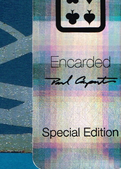 As part of the TT Reward tier, Encarded hand made a special 3-deck box and called it the MegaTuck. It holds one of each deck in the Trilogy: Tendril, Ascendant and Nightfall. It is hand-crafted of fine papers, with precision cut viewing windows that show the three holographic signature seals from each deck, as well as a top window to get a small peek inside. There is a contrasting belly band with a hand foiled Tendril design and the individual edition number. The box is signed in silver ink.