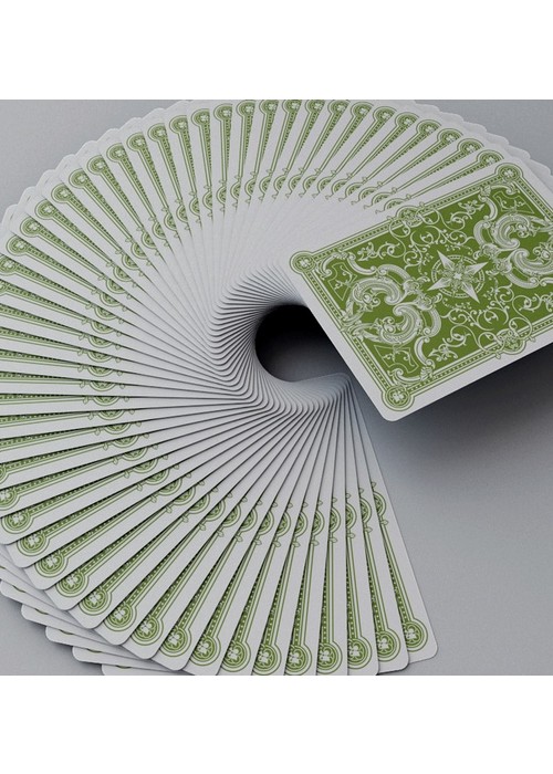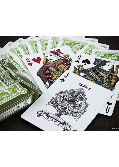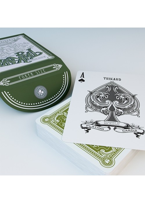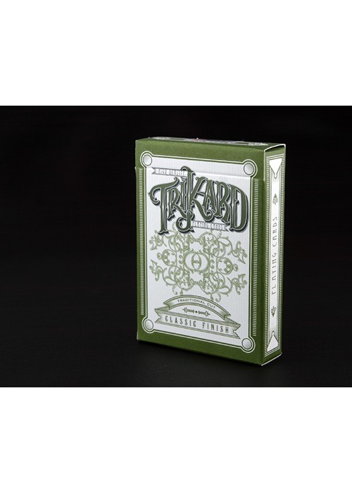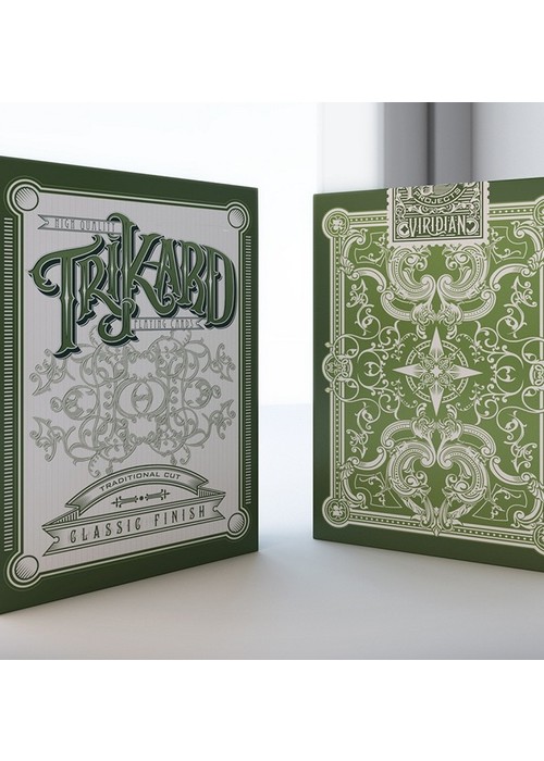 Viridian playing cards feature a custom vintage design, reimagined courts, a beautifully crafted tuck case and a stamp bearing an intricate custom design. A deck that is as beautiful as it is functional, Viridian is the first in Trikard’s new line of Signature playing cards – versatile for magic, card flourishing or even just a game of poker.