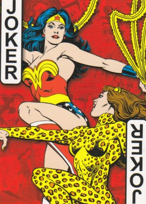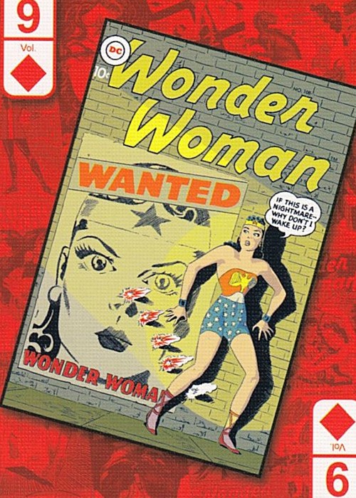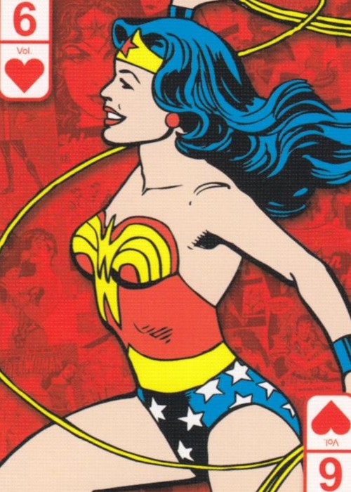 Images of covers of Wonder Woman comic book alternate with images of Wonder Woman throughout the years. Images of all the cards can be seen http://www.marytcusack.com/maryc/Cards/WonderWoman2.html