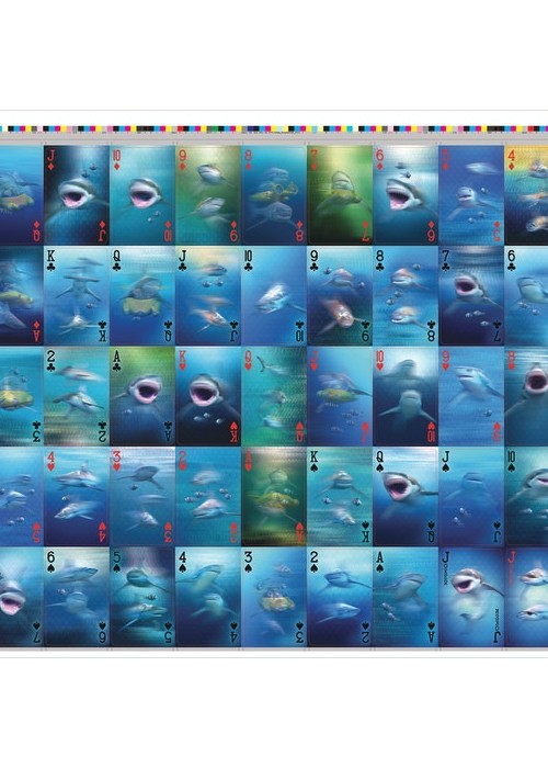 3D playing cards feature 54 unique 3D images, a different fully 3D Shark image for each card. To block out all light from passing through the otherwise transparent lens and give the pips a pleasing metallic shimmer, our cards are constructed from a metallic foil core sandwiched between a thin optical lens for high quality 3D and a soft touch PET laminate for smooth shuffling. All card images are printed in cutting edge lenticular 3D, giving you over an inch of depth in the thickness of a standard playing card. All without the need for special equipment or viewing techniques.