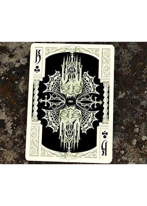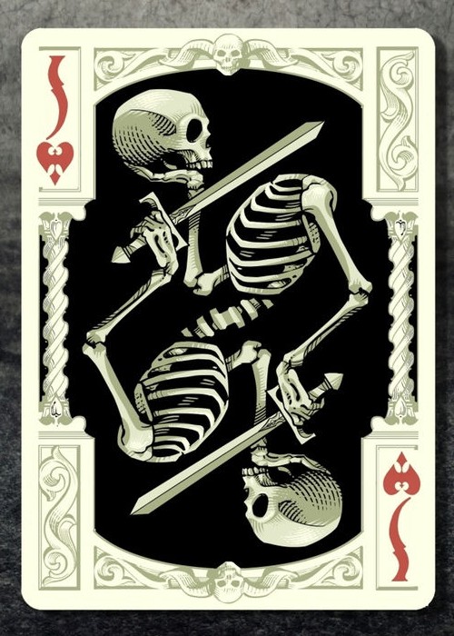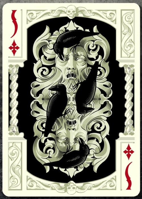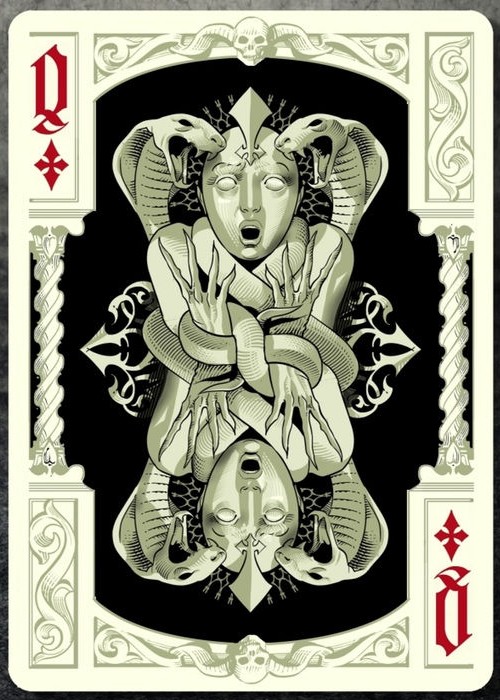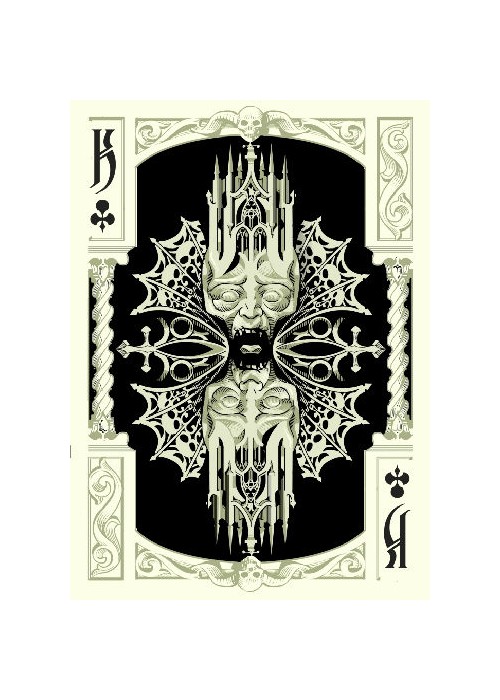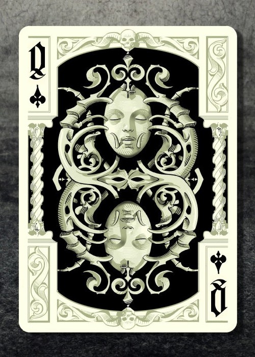 Grotesk Macabre is the evolution of Grotesque, which was the UC2014 annual deck. Taking this deck as a starting point, I tried to create my own vision of the Underworld. Although a joyful and positive person myself, I had always been attracted to dark themed artwork. I find fascinating how artists throughout the centuries have imagined the world of the dead and how they dealt with the greatest fear of mankind. In Grotesk Macabre I tried to combine the darkest of all themes with the heavy elegance of baroque and the pointy, flamboyant Gothic art.