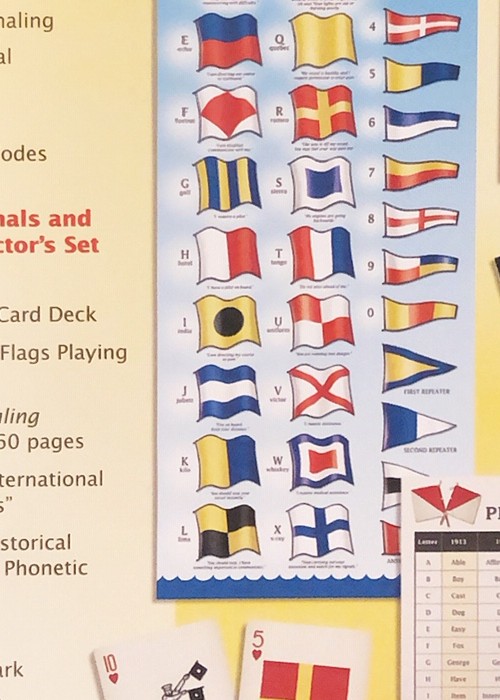 A set of two decks of cards. The one with blue backs shows naval signal flags and morse code. The spades and hearts suits show the flags for the letters of the alphabet, and the clubs and diamonds suits show various other signal flags. The jokers show the flags for sending and receiving. The other deck with black backs shows semaphore and morse code. The spades and hearts suits show flag positions from the front for sending, and the clubs and diamonds suits show flag positions from the back for receiving. The jokers show flag positions from the front and back, respectively, for Attention! The backs are one way. Also included in the box are a booklet on ‘The History of Signaling’ (sic); a morse code bookmark; a poster of ‘Historic Development of the Phonetic Alphabet’; a poster of ‘International Nautical Signaling Flags’ (sic); two cardboard devices to practice morse code; two cardboard wheels showing signal flag positions with flags.