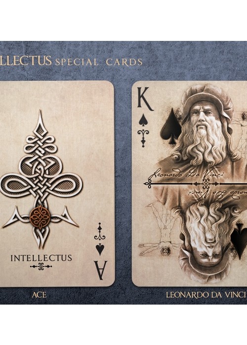 One of 3 decks in the Inception series (Inceptus, Illustratum, Intellectus) of 54 cards each, this KickStarter project was funded by 734 backers pledging $42,479 on May 17, 2016 and delivered in October 2016. For the most part these all contained the same cards with different tuck and back, but in addition each deck had a unique Ace and King of Spades. Each deck as also made available in uncut form, plus dealer coins, shirts and leather case as part of the Deluxe reward. There also was a signature reward that included all 3 decks in a special gold foil designed case with signature cards.