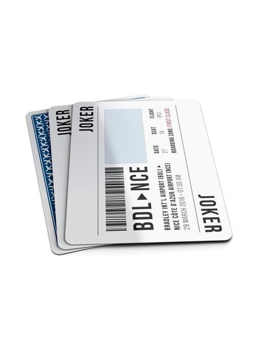 The deck includes two untraditional, yet functional Jokers that resemble a pair of fictitious airline boarding passes for a round trip flight. Each of the Jokers will show variation between the two, making them ideal for gameplay. Hidden within one of the Jokers will be an Eight of Clubs reveal. Additionally, as an added bonus for the traveling magician, both Jokers will have a location dedicated for a written prediction or signature.